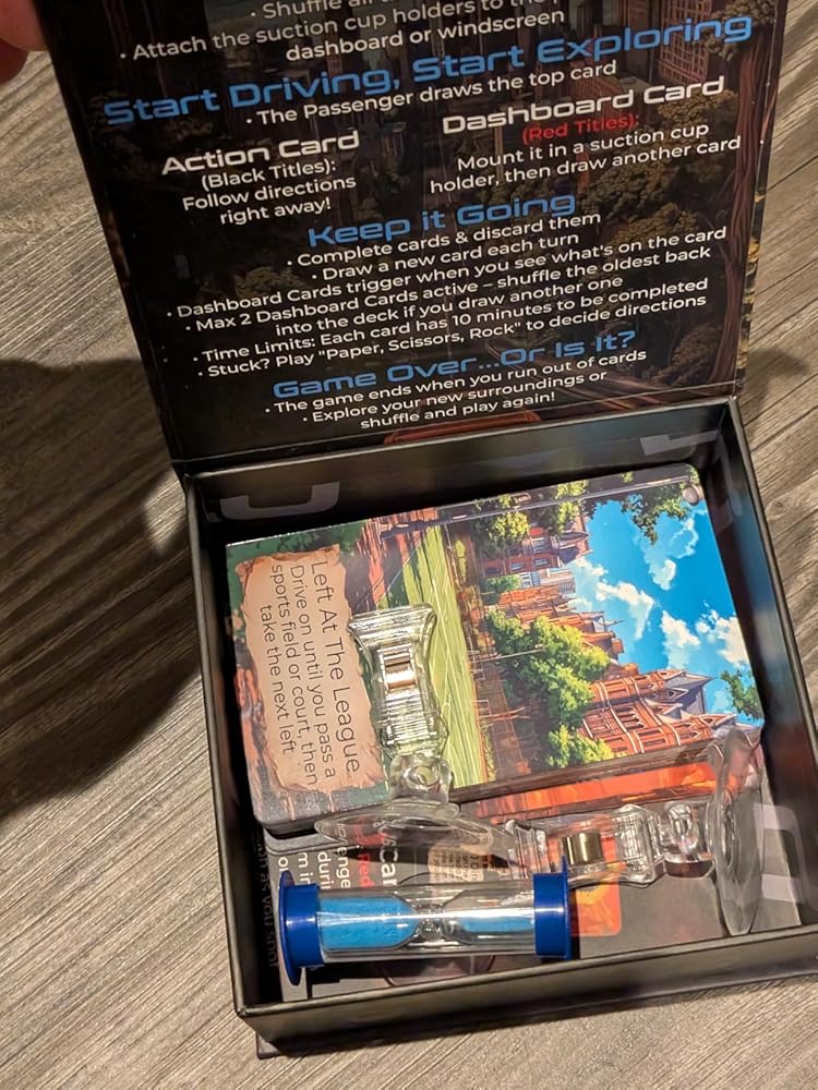 So this game is actually really awesome! I was unsure when I ordered it, I never seen a game like this one but now that I got the game and opened it and took a better look I am definitely impressed! I got it for my dad cause when I was growing up, a lot of times when he was bored or just been sitting home to long he would tell me and my mom to get ready to go on a drive and then we would just go on a drive and either end up somewhere fun or far away or sometimes just to the store and back. Then I saw this game and it made me think of my dad. I'm not much for just getting in my car and taking off for a drive cause I'm bored like my dad is but I was still intrigued. It actually ended up being a lot of fun! It came in a really nice box and it's got a little timer with a suction cup on it so you can suction it to the dash in your car and then it has 2 other suction cups with clips on them so you can suction them to the dash and the clips hold the card for you. This was definitely a great purchase! Even though I'm not the type who usually likes to go on road trip adventures, I'm more of a stay home type of person but this game makes me want to go on a road trips now every time I look at it now! And for those people who do love road trip adventures, then this is most certainly a game you need to get but I also recommend it to everyone else too cause like I said I'm a homebody and i had a blast playing it!